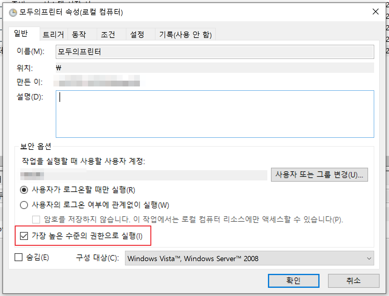 이름을 잘~만든후 가장높은 수준의 권한으로 실행에 체크를 해줍니다.