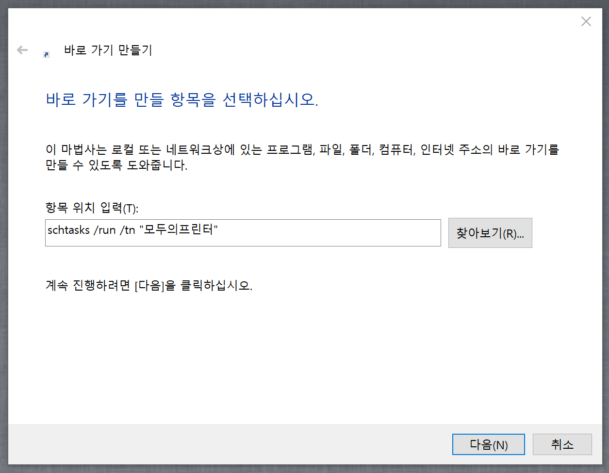 schtasks.exe /run /tn "모두의프린터" 를 입력하신후 생성하시면 됩니다.